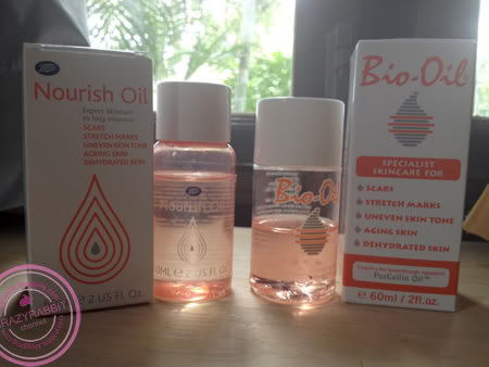 (ส่วนผสม บน เป็นของ Bio oil ด้านล่างเป็นของ Boots Nourish Oil ค่ะ)