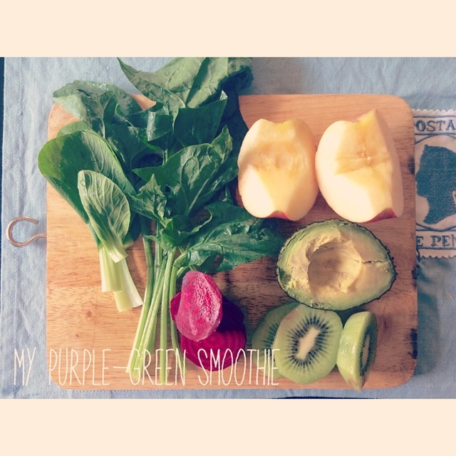 อีกสูตรที่ใส่บีทรูทแล้วเราว่ากินง่าย คือสูตรนี้ มีปวยเล้ง กวางตุ้ง บีทรูท (ฝานสามชิ้น) กีวี่ แอปเปิ้ล อโวคาโด้ น้ำผึ้ง มะนาว