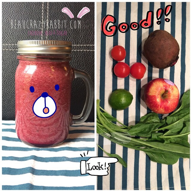 มีบีทรูท ครึ่งหัว มะเขือเทศสามลูก แอปเปิ้ล ปวยเล้ง มะนาว น้ำผึ้ง น้ำส้ม แต่สูตรนี้ขอบอกเลยว่า กินยาก เพราะบีทรูทจะให้รสฝาด แต่เพื่อสุขภาพ กินมันเข้าไป