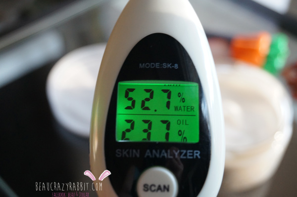 เราลองวัดความชุ่มชื้น (ลืมถ่าย Before) ก่อนที่จะทา ผิวแห้งผากมาก คือ อยู่ในห้องแอร์ทั้งวัน ไม่ได้ทาครีม ความชุ่มชื้นผิวมีแค่ 20% พอทาครีมอันนี้ลงไปแล้ววัดใหม่ ได้ค่าสูงถึง  52.7% มันชุ่มชื้นมากจริงๆ ค่ะ