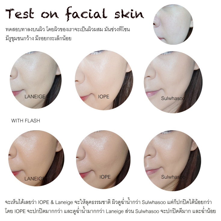 จะเห็นได้เลยว่า IOPE & Laneige จะให้ลุคธรรมชาติ ผิวดูฉ่ำน้ำกว่า Sulwhasoo แต่ก็ปกปิดได้น้อยกว่า โดย IOPE จะปกปิดมากกว่า และดูฉ่ำน้ำมากกว่า Laneige ส่วน Sulwhasoo จะปกปิดดีมาก และฉ่ำน้อย