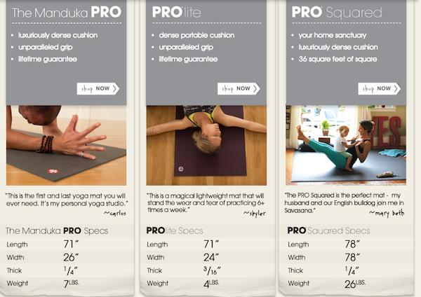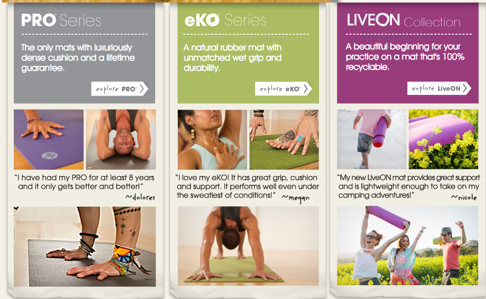 เสื่อ Manduka มีสามรุ่นหลักๆ คือ  Pro, Eko, Live ON