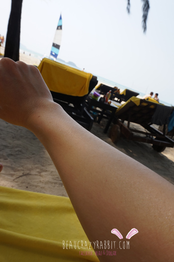 โบว์ลองทาที่ตัวโบว์ก่อน สูตรนี้บางเบา ซึมเข้าผิวได้เร็ว ไม่ทิ้งคราบขาวๆ ไว้ ไม่เหนอะหนะเหมือนครีมกันแดดอื่นๆ ดีค่ะ