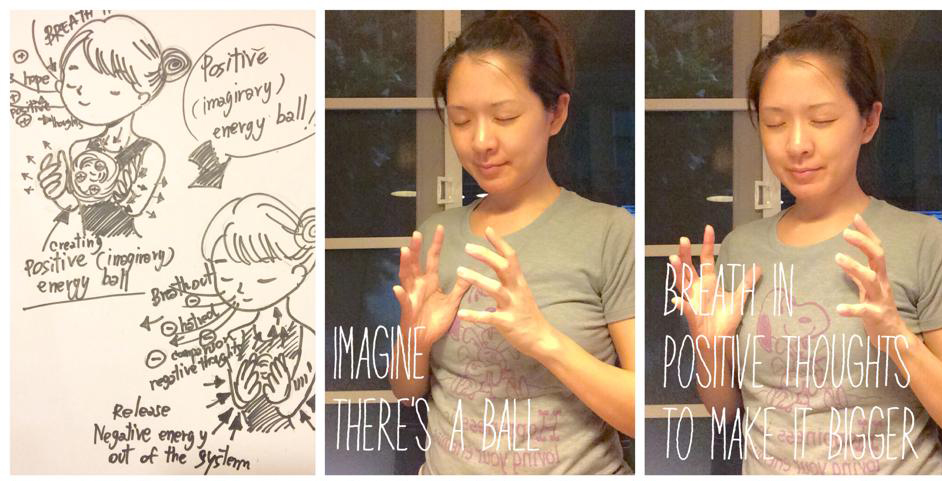 เริ่มจาก ทำมือเหมือนมีลูกบอลเล็กๆ ที่หน้าอก พอหายใจเข้า ให้จินตนาการว่า เราหายใจสูดพลังด้านบวกเข้าร่างกาย (inhale love ) นึกถึง ความรัก การให้อภัย สิ่งดีดีที่เกิดขึ้นกับตัวเรา ข้อดีของคนที่เราอาจจะกำลังโกรธอยู่ คิดถึงรอยยิ้มของคนที่เรารัก แล้วมือที่ถือลูกบอลของเราก็ค่อยๆ ลูกใหญ่ขึ้นๆ ตามลมหายใจที่สูดเข้าไป เราจะสัมผัสได้ถึงพลังงานที่ปลายนิ้วของเรา (ต้องลองดูเองนะ)