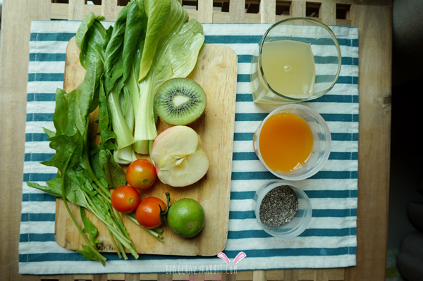 ส่วนผสมมีดังนี้ (เพิ่มลด ตามใจชอบค่ะ) : ผักปวยเล้ง ผักกวางตุ้งไต้หวัน มะเขือเทศ แอปเปิ้ลฟูจิ กีวี่ น้ำมะนาว น้ำสับปะรด น้ำส้ม เมล็ดเชีย จะเพิ่มน้ำผึ้งก็ได้ค่ะ