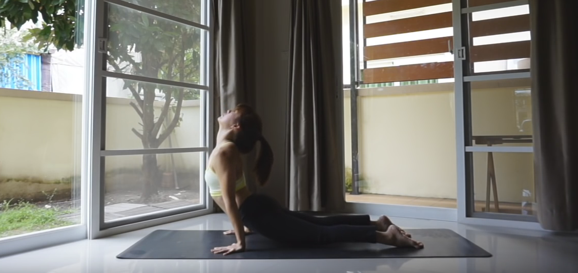 แล้วค่อยยกหน้าอก ดันตัวขึ้นจนหน้าขาลอยจากพื้น เป็น upward facing dog