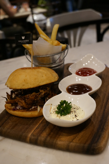 จานต่อมาเป็น Vegan Pulled Pork BBQ Burger ข้างในเป็นเห็ดนะคะ ซอสบาร์บีคิว อร่อยเลย แต่ไม่ประทับใจเท่าสองจานแรกนะ