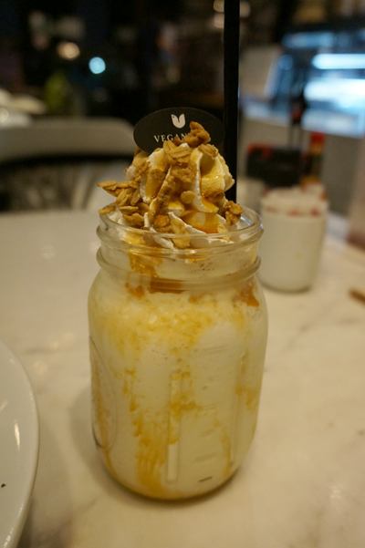 ต้องขอบอกก่อนว่าร้านนี้เป็นมังสวิรัติแบบ Vegan นะคะ นั่นคือ ไม่มีนม ไม่มีไข่ ไม่มีชีส แต่เค้าก็ทำวิปครีมออกมาด้วยนมครีมมะพร้าวนี่แหละมั้ง เดา (ฮ่า) ส่วนนมนี่น่าจะเป็นนมอัลมอนด์ รสชาติคือ อร่อยเลย ไม่ออกแนวอาหารเจ แบบกลิ่นถั่วๆ เต้าหุ้ แบบนี้ไม่มีเลย