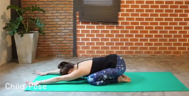 เสร็จจากท่าเมื่อกี้ เราก็แยกเข่าเล็กน้อย นิ้วโป้งเท้าชิดกัน สไลด์มือไปด้านหน้าไกลๆ เอาหน้าผากวางแผ่นแมต