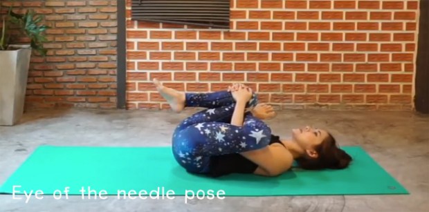 ท่านี้จำง่ายๆ คือ การ ร้อยด้ายเข้ารูเข็ม เราจะชันเข่าขึ้น วางข้อเท้าขาอีกข้างบนเข่าที่ชันขึ้น แล้วสอดมือเข้าไปในช่อง เหมือนการร้อยด้ายเข้าเข็ม เสร็จแล้วอ้อมมืออีกข้างไปจับเข่า ดึงเข่าหาอกเบาๆ