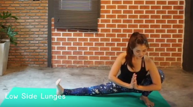 ท่านี้คือดีมากสำหรับการยืด adductors แฮมสตริง และช่วยเปิดฮิปด้วย แต่บางคนที่ตึงมากๆ อาจจะวางส้นเท้าลงไปไม่ได้ ให้เอาผ้าม้วนวางใต้ส้นเท้าได้ ถ้าทรงตัวไม่อยู่ให้เอามือวางด้านหน้าได้ หรือถ้าไม่ไหวจริงๆ จะเอาบล๊อกมารองใต้ก้นแล้วยืดต้นขาไปด้านข้างก็ได้เช่นกัน