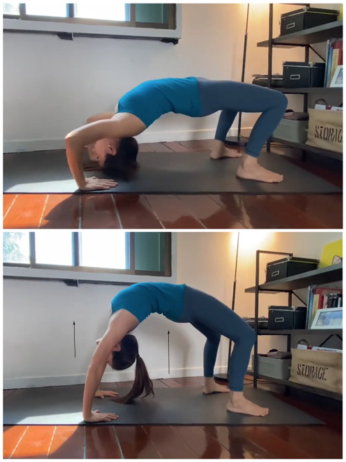 ส่วนต่อไปที่ทำให้สะพานโค้งของเราสามารถขึ้นมายืนได้ นั่นคือ ระยะห่างของมือกับเท้าต้องใกล้ๆ และอกเราต้องเปิด เราอาจจะ exercise ผลักอก ยืดขา แบบรูปแรก แล้วค่อยๆ หัดเดินมือเข้ามาใกล้ เมื่อระยะมือกับเท้าของเราได้แบบรูปล่างแล้ว เราก็พร้อมขึ้นมายืนได้