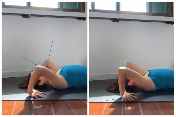 สำหรับคนที่ยังไม่มีแรงแขนมาก อาจจะยกขึ้นทีเดียวไม่ได้ ให้วางกลางศีรษะก่อน แต่เวลายกขึ้น ให้พยายามยกขึ้นตรงๆ พร้อมทั้งผลักขาแบบในรูป เพื่อให้น้ำหนักอยู่ตรงกลางไม่เทไปทางใดทางหนึ่ง